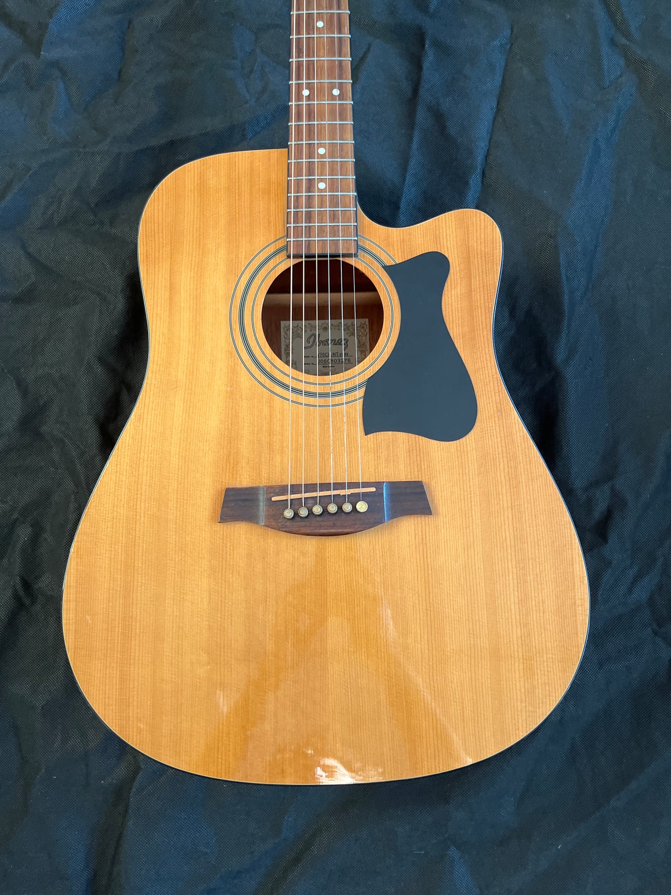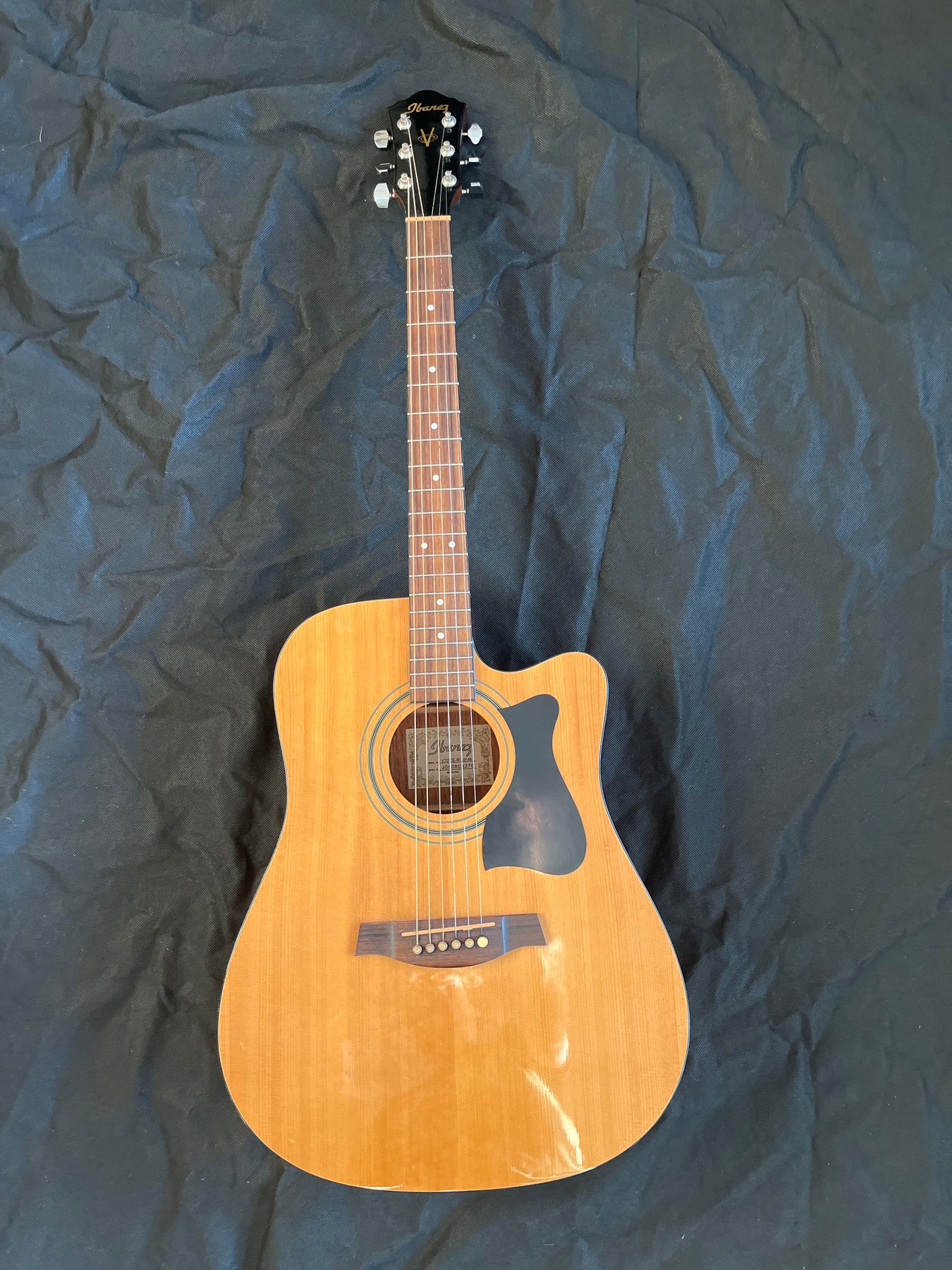 Is a popular dreadnought Electro-acoustic guitar known for its easy playability, thanks to a comfortable C-shaped neck and soft cutaway for upper fret access. It features a spruce top with mahogany back/sides for decent tone, and comes with  Ibanez electronics (pickup & preamp) with EQ.